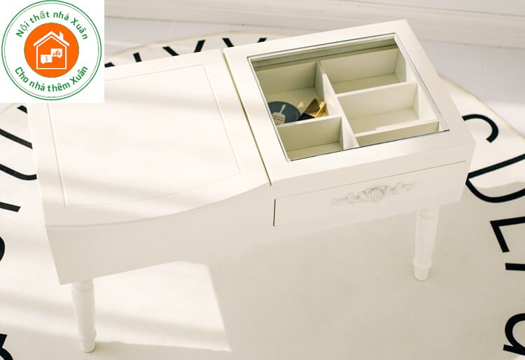 Mặt bàn trang điểm mini được bố trí nhiều ngăn chứa đồ tiện dụng, bạn có thể thoải mái phân chia đồ trang điểm của mình. Một ô để son, 1 ô để phấn, ô để trang sức,…… rất thuận tiện khi lấy. Dù là ban đêm, không cần bật điện bạn vẫn có thể tự tìm được thứ mình cần.